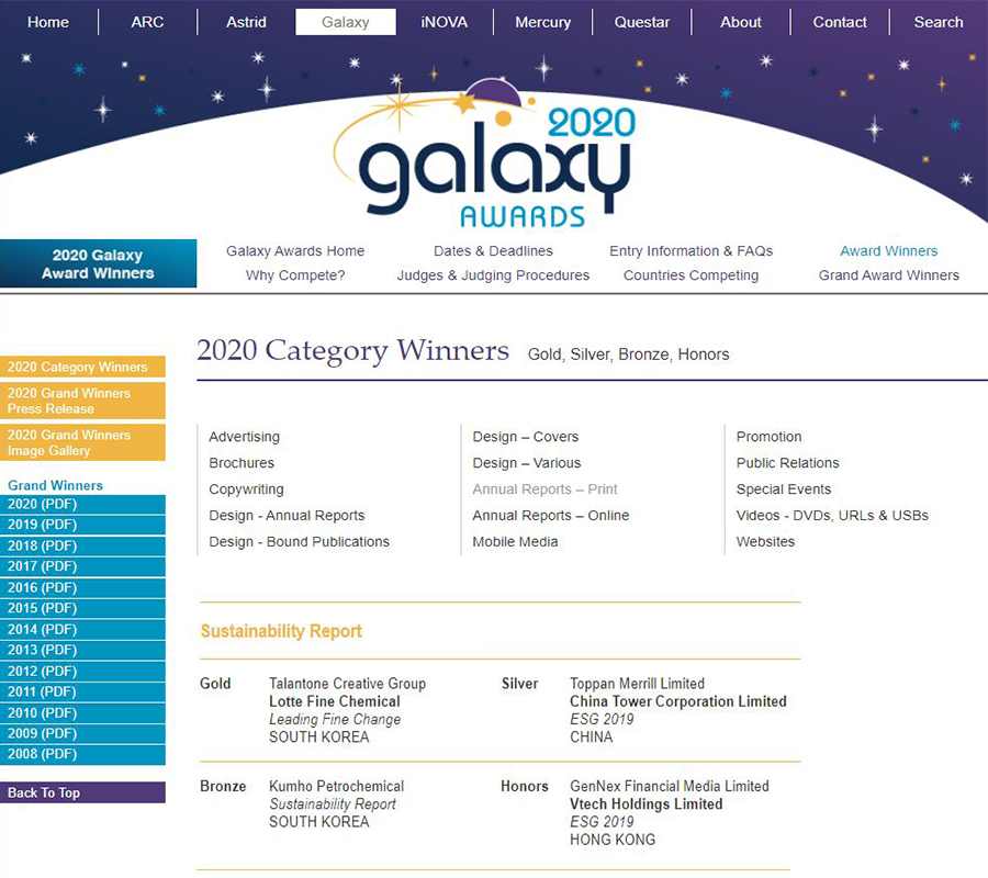 □ 2020 Galaxy Awards : 지속가능경영보고서(인쇄본) 영역 금상(1위)